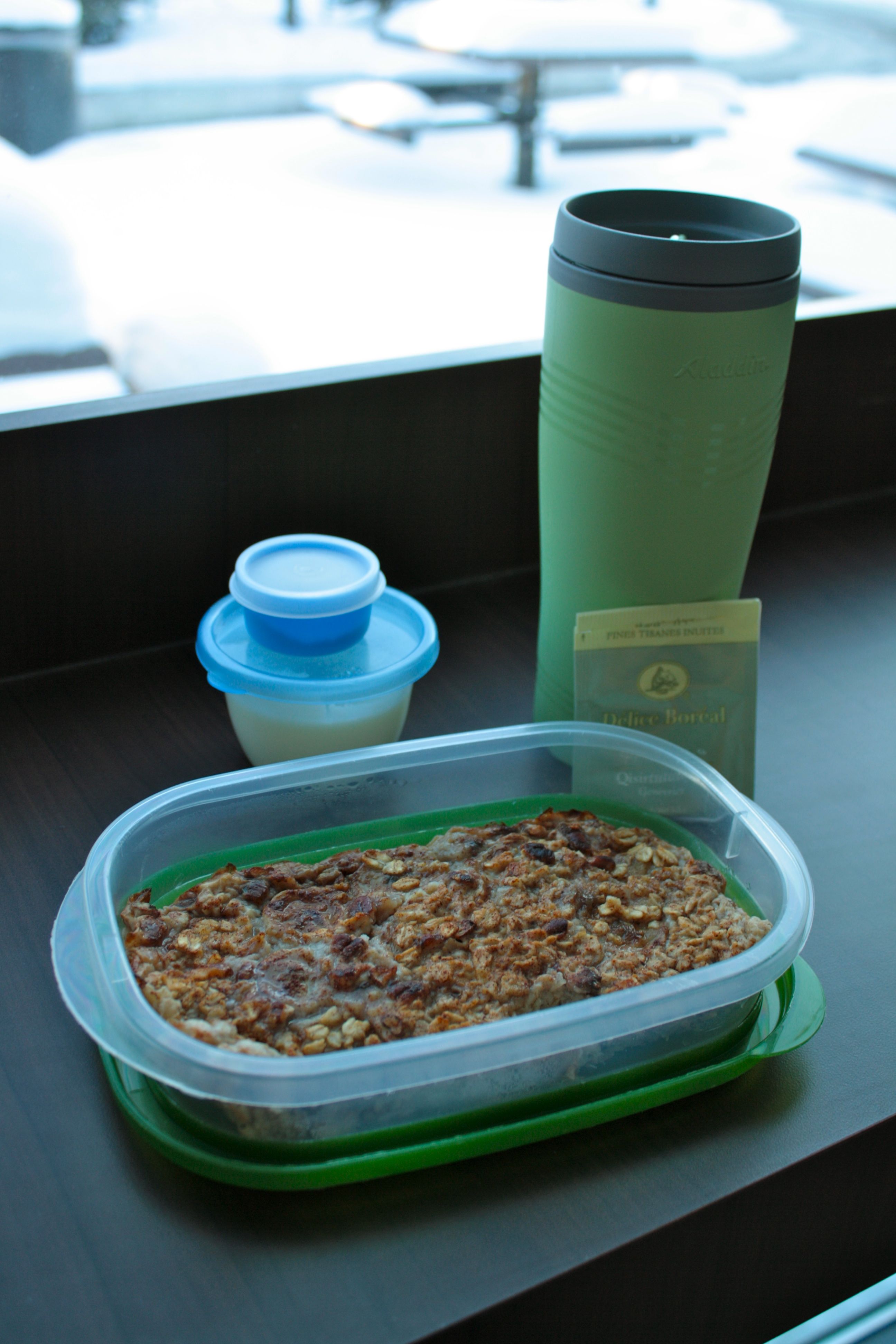 Je suis très heureuse de vous annoncer que le gruau caramélisé aux bananes est toujours aussi bon le lendemain. Le dessus n’est plus croustillant, évidemment, mais le goût est le même. Accompagné de 100g de yogourt nature 2% et d’une c. à soupe de graines de lin moulues plus un thé au Genévrier de Délice Boréal (bof, pas leur meilleur), c’était très saitsfaisant! Le mélange banane-gruau-lait-noix est difficile à battre pour se remplir l’estomac le matin. Riche en fibres et protéines, ça évite que votre ventre ne vous lance des appels au secours deux heures plus tard. Vous êtes de ceux qui n’arrivent pas à manger en vous levant le matin? Amenez votre déjeuner au boulot! Bien qu’il soit recommandé de manger dans l’heure suivant le réveil, ne vous rendez pas malade! Si, par contre, vous pensez que vous perdrez du poids en sautant le déjeuner, détrompez-vous, c’est la pire chose à faire. Votre organisme se mettra en mode famine et, de un, vous risquez de manger deux fois plus au dîner car vous aurez passé le matin à vous ronger de l’intérieur et, de deux, votre corps mettra en réserve plus de lipides et de glucides que nécessaire afin de se préparer à un futur état de jeûne… Juste un fruit, un yogourt et un petit plat de céréales à grains entiers ou une sandwich au beurre de peanuts et bananes glissés dans votre sac à main ou boîte à lunch rendront votre estomac tellement heureux!