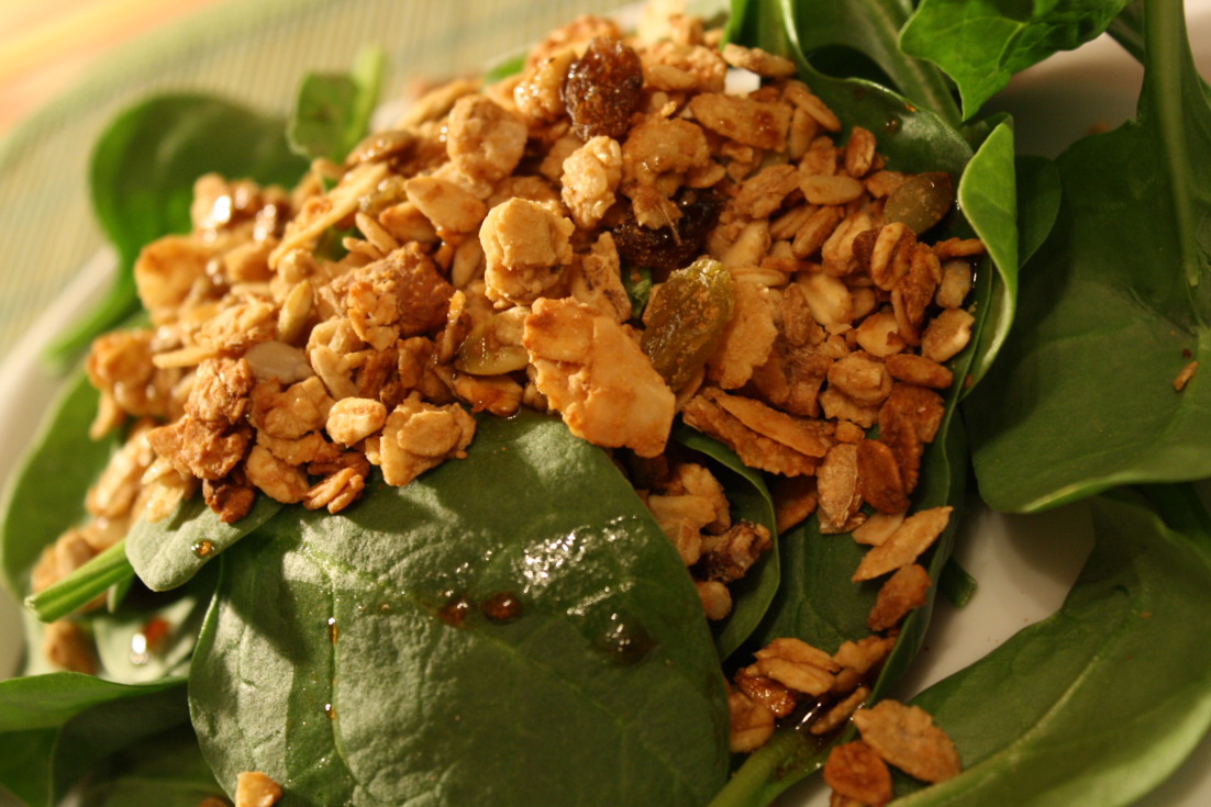 La salade était délicieuse. J’adore le mélange épinards et granola avec un filet de vinaigrette maison (1/3 huile d’olives, 1/3 vinaigre balsamique, 1/3 sirop d’érable, sel, poivre).
