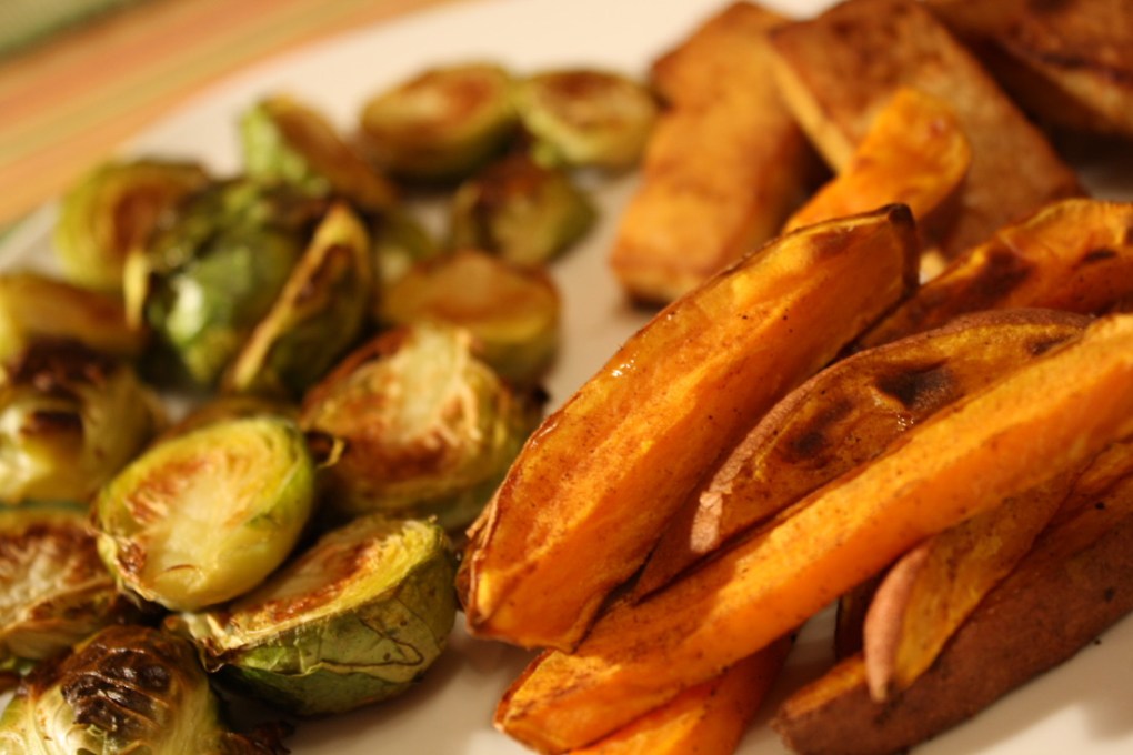 - Mettez les « frites » et les choux de Bruxelle dans un grand bol et versez un filet d’huile d’olives. Enrobez-les bien à l’aide de vos mains. Placez-les sur une plaque de cuisson. Saupoudrez les « frites » d’un mélange à épices douces et les choux de Bruxelle d’un peu de poudre d’ail et de piment de cayenne.