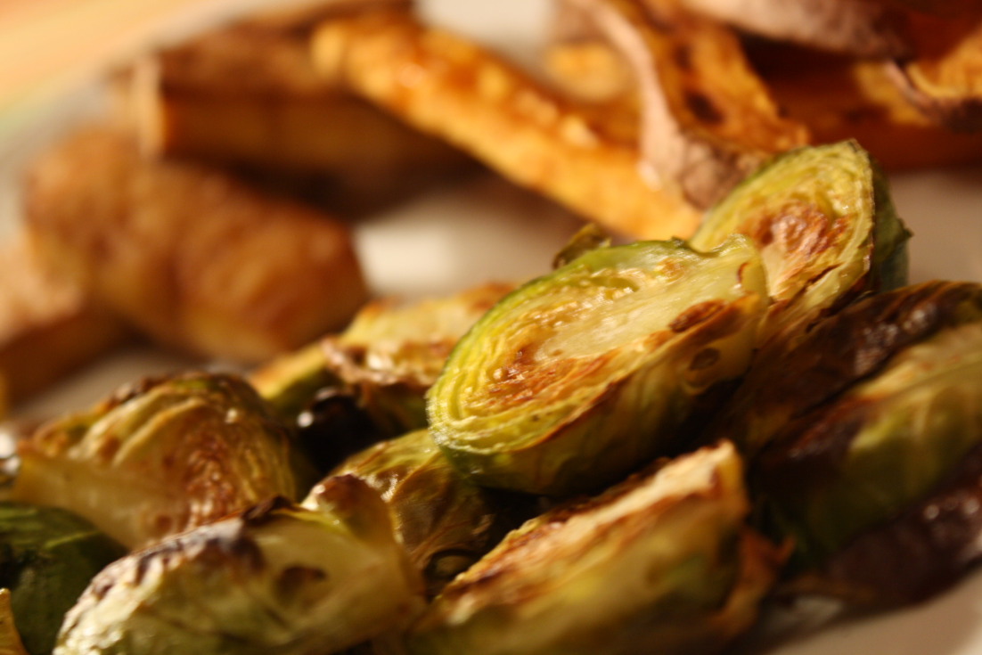 Et maintenant, qu’est-ce qui arrive quand on fini de travailler plus tard qu’à l’habitude et qu’on a le ventre creux lorsqu’on passe à table? Ce qu’on avait prévu pour deux repas disparaît en moins de deux! Le contenu de la plaque que vous voyez ci-dessous a été dévoré dans le temps de dire « choux de Bruxelle »! Je suis tellement triste d’avoir passé les 25 premières années de ma vie à lever le nez sur ce légume… Je pourrais en manger tous les jours pendant un mois sans m’écoeurer je crois. Ça ne ferait pas un blogue de cuisine particulièrement intéressant par contre.