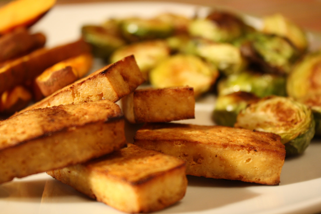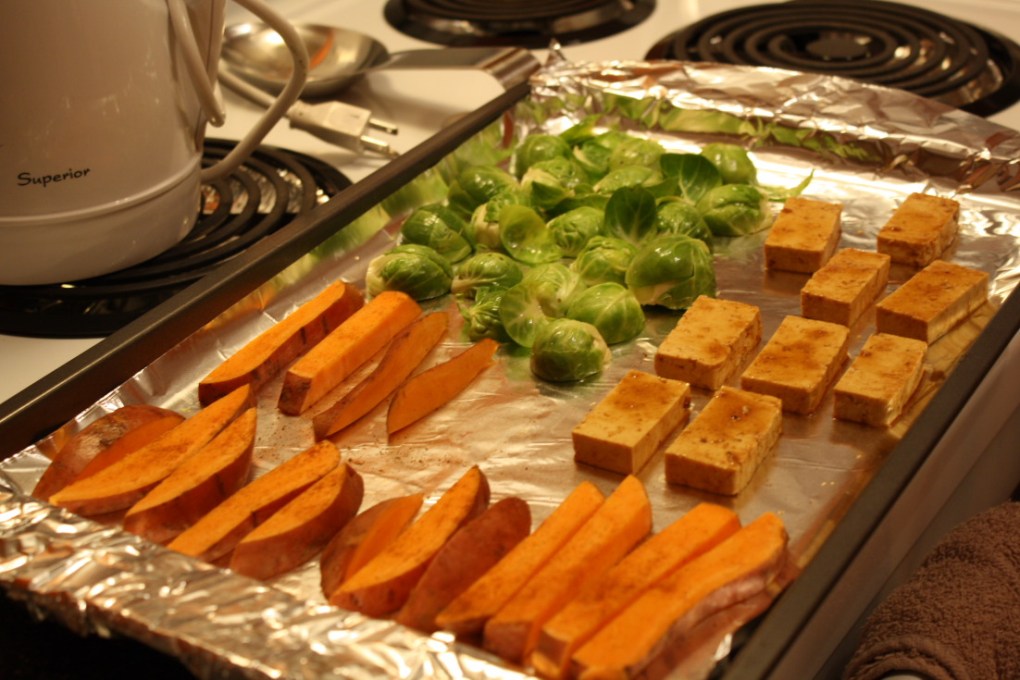- Coupez la patate en « frites », les choux de Bruxelle en deux (gardez les petites feuilles qui tombent, c’est le meilleur!) et le tofu en croquettes.