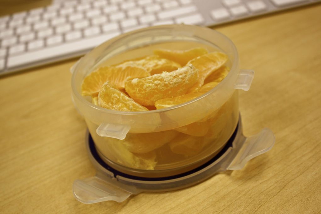 En avant-midi, ma collation habituelle : une petite orange et une clémentine suivie d’un mélange de fruits séchés et de noix. Comme j’ai déjeuné tôt, j’ai mangé les fruits vers 9h et les noix vers 11h. Ça me permet de garder mon niveau d’énergie assez stable et ça évite à mon estomac de grogner.