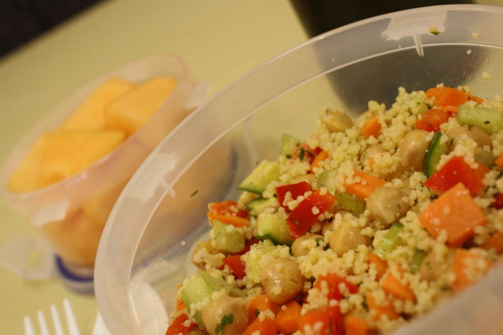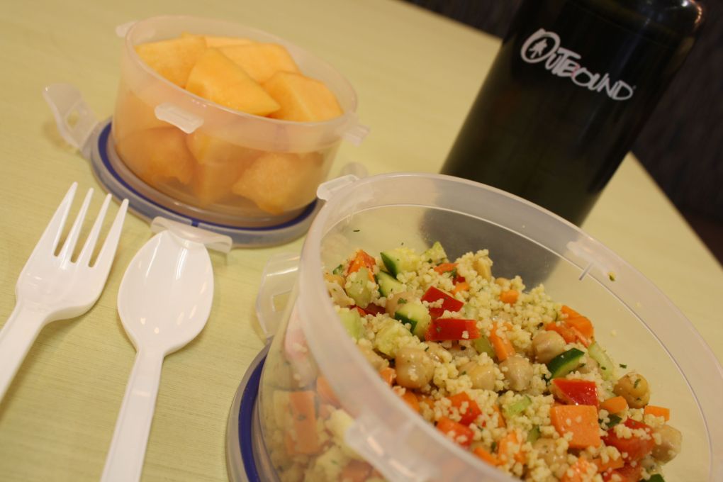 Un petit lunch tout simple ce midi. Le reste de mon couscous aux légumes et environ 1 t. de cantaloup en morceaux (finalement, il va me durer deux semaines ce fruit! Sérieusement, il était ÉNORME! note à moi-même : acheté le plus petit de la gang la prochaine fois). J’ai apporté la moitié de ma recette de couscous à une amie qui vient d’accoucher et qui n’a plus trop le temps de cuisiner. Ça m’évite d’en manger pendant une semaine et ça lui fait bien plaisir! Je partage souvent mes recettes comme ça car ça me permet de cuisiner plus souvent et de manger des choses différentes!