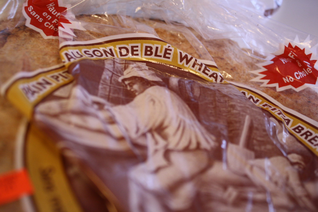 - 1 pain pita de blé entier (j’en ai trouvé une nouvelle sorte géniale au Métro près du travail, voir la photo plus bas)
