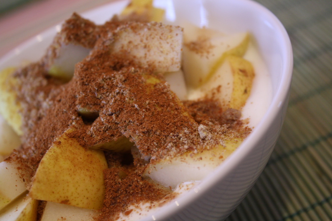 Comme dessert, environ 150 g de yogourt nature (ce qui restait dans le pot), une c. à soupe de graines de lin moulues, une poire Bartlett en morceaux et un peu de cannelle! Yum!