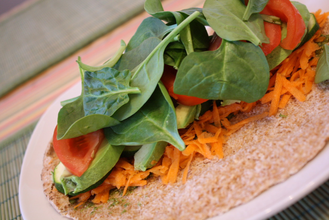 Sur le blogue de Carrots N’ Cake, Tina demandait quel était notre condiment préféré. Après mûre réflexion, je me suis dit que le pesto figurait en première place sur ma liste. Ça m’a donné le goût de le mettre au menu ce midi, voici donc mon pita pesto-légumes!