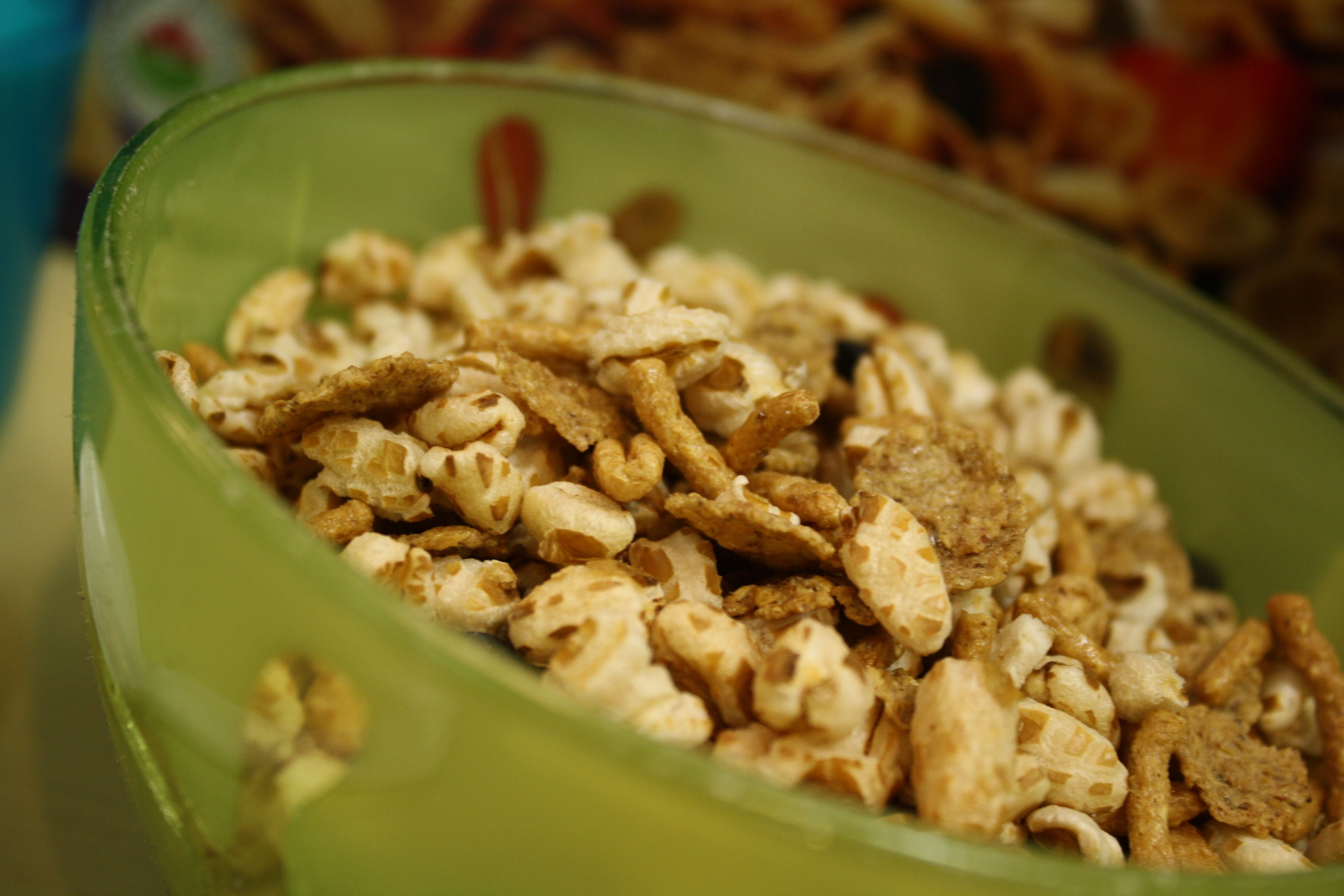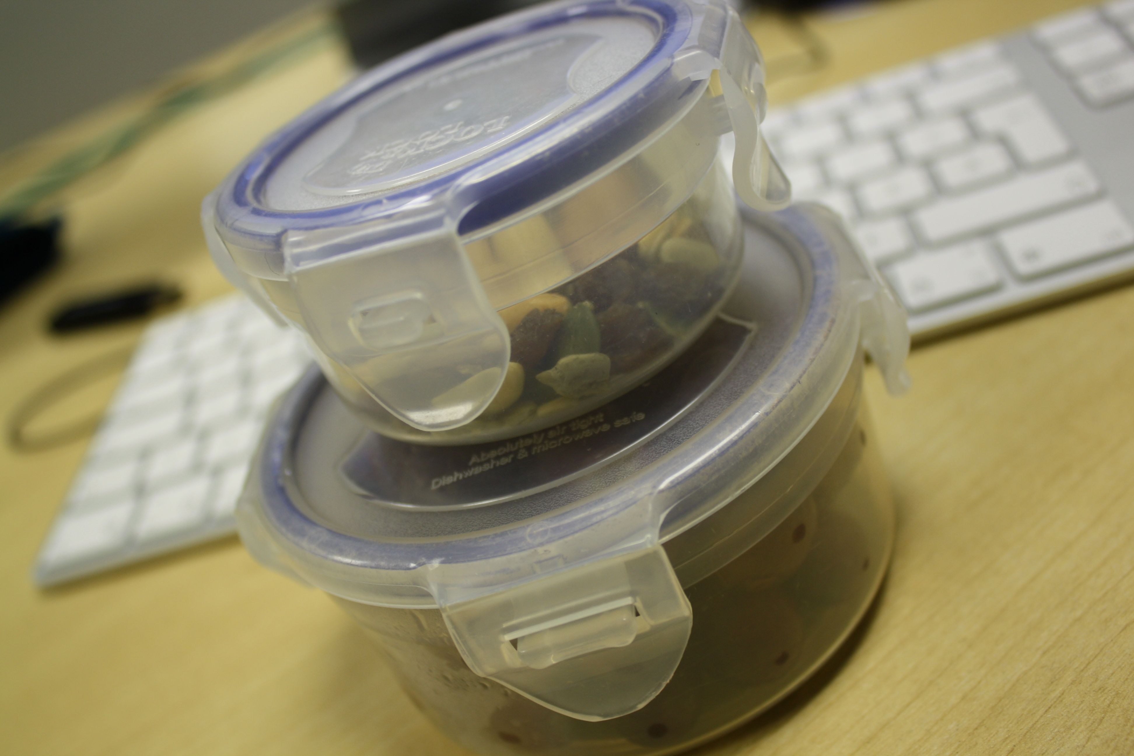 Comme collation, 1 t. de raisins rouges et environ 1/4 de t. de noix mélangées. Les mesures que je donne sont généralement approximatives pour ce genre de choses. Je sais que certains plats logent 250 ml ou 125 ml alors j’y vais à l’oeil à partir de là.