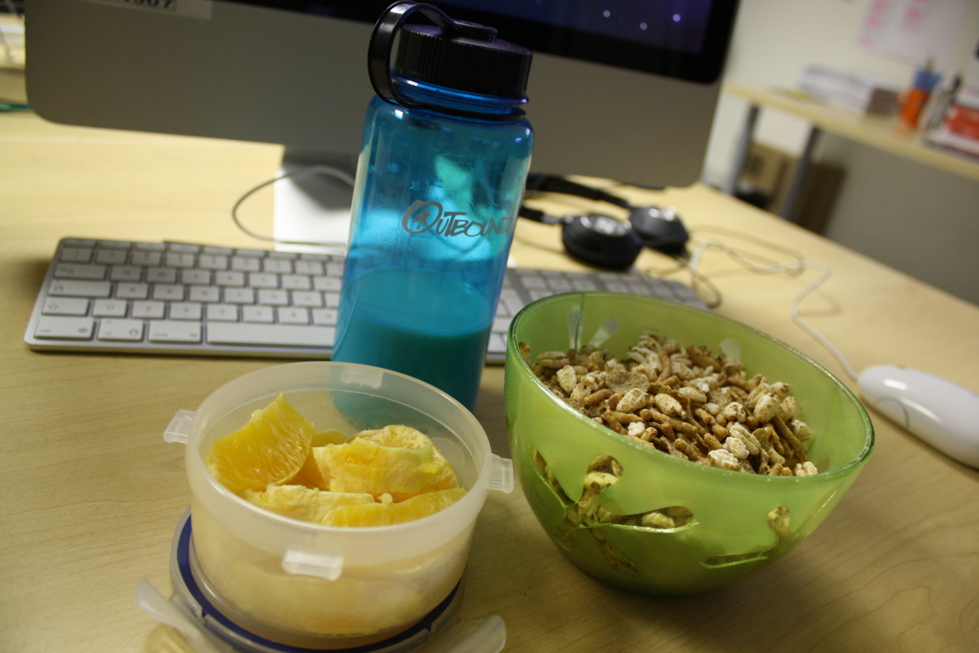 Ma boîte de céréales m’attendait ce matin! J’ai amené 1 t. de lait de soya non-sucré et 1 orange pour compléter mon déjeuner.