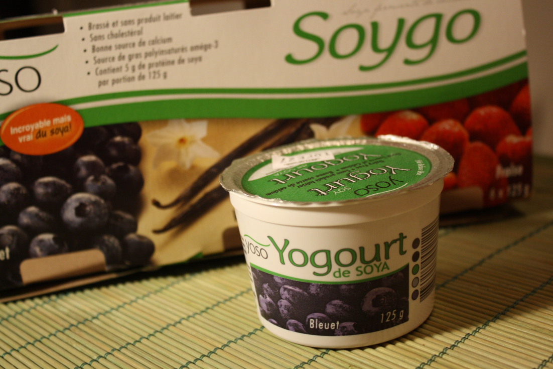 C’était délicieux! Comme dessert, un faux yogourt aux bleuets à base de soya. J’ai vu ça dans la section bio de mon épicerie lors de ma dernière visite alors j’ai décidé de lui donner une chance. Je trouve que la texture est belle (ça ressemble plus à un pouding qu’à un vrai yogourt) mais le goût est un peu étrange. Très chimique en fait, un peu comme les yogourts Source ou autres marques semblables, sans gras et plein de sucres artificiels. Bref, je ne suis pas convaincue… Il y avait une saveur de vanille et une saveur de fraises également dans l’emballage, j’aurai peut-être plus de chance?