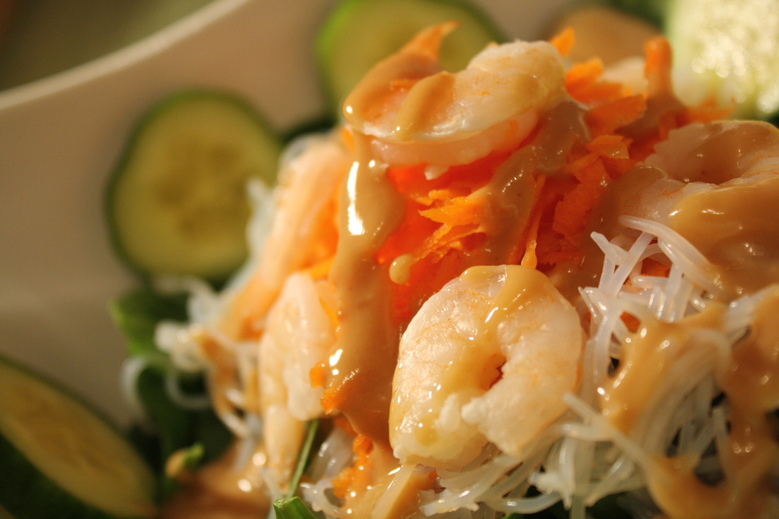 Pour souper, je voulais utiliser les restes de mes rouleaux de printemps sans faire les rouleaux alors j’ai mis le tout dans une salade! De la sauce aux arachides en guise de vinaigrette? Yah! J’ai dilué la deuxième portion de sauce avec un peu d’eau et voilà!