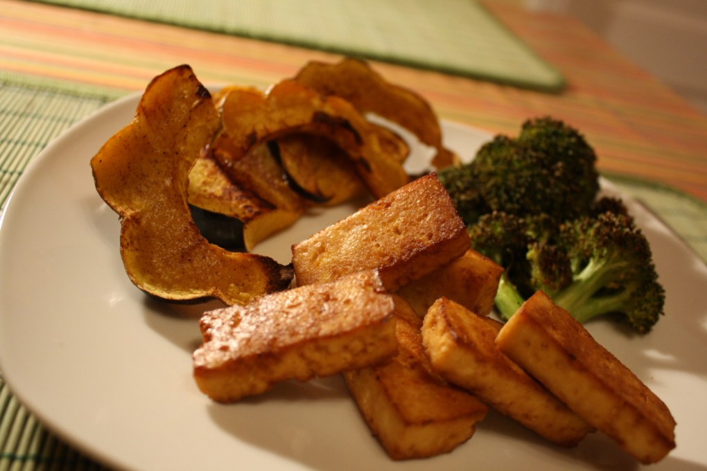 Ce soir, un bon souper tout simple! Réapparition de ma nouvelle meilleure amie, la courge poivrée, accompagnée de brocoli et de tofu cuits au four avec la sauce spéciale tofu. Mium!