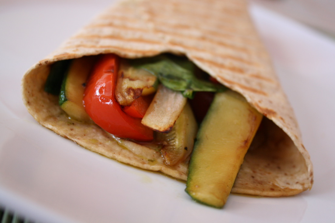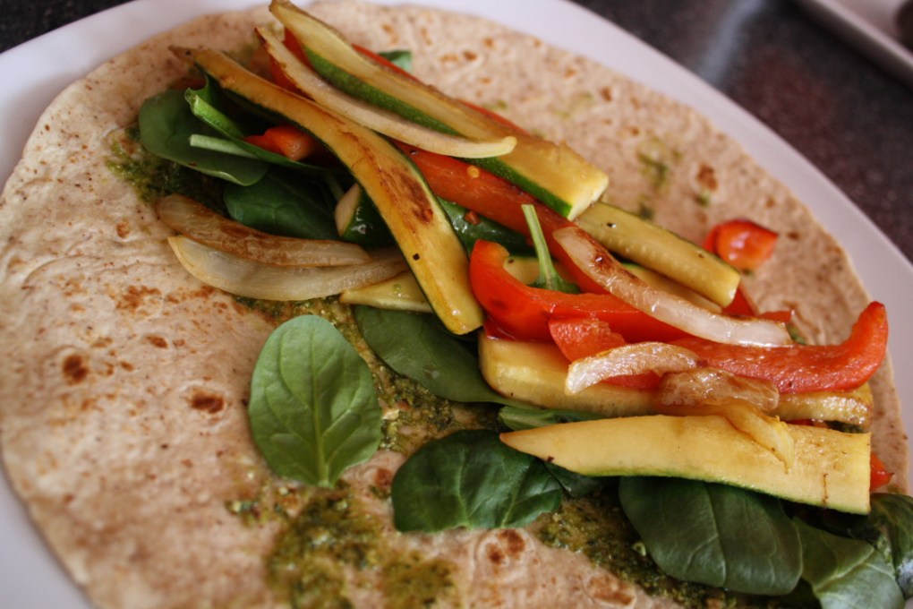 J’ai ressorti mon grill à panini ce midi. Si vous n’en possédez pas, vous pouvez presser vos wraps dans une poêle pour le même croustillant (sans les petites lignes toutefois). Pour mon wrap aux légumes grillés, j’ai d’abord fait revenir l’oignon et le poivron rouge dans un peu d’huile. J’ai ajouté des tranches de courgette et des épices (sel, poivre et flocons de piment). J’ai étendu environ 1 c. à soupe de pesto sur la tortilla de blé entier et ajouté quelques épinards.