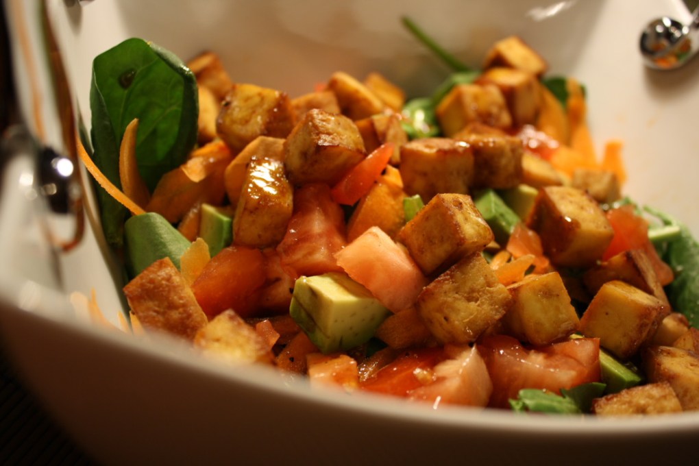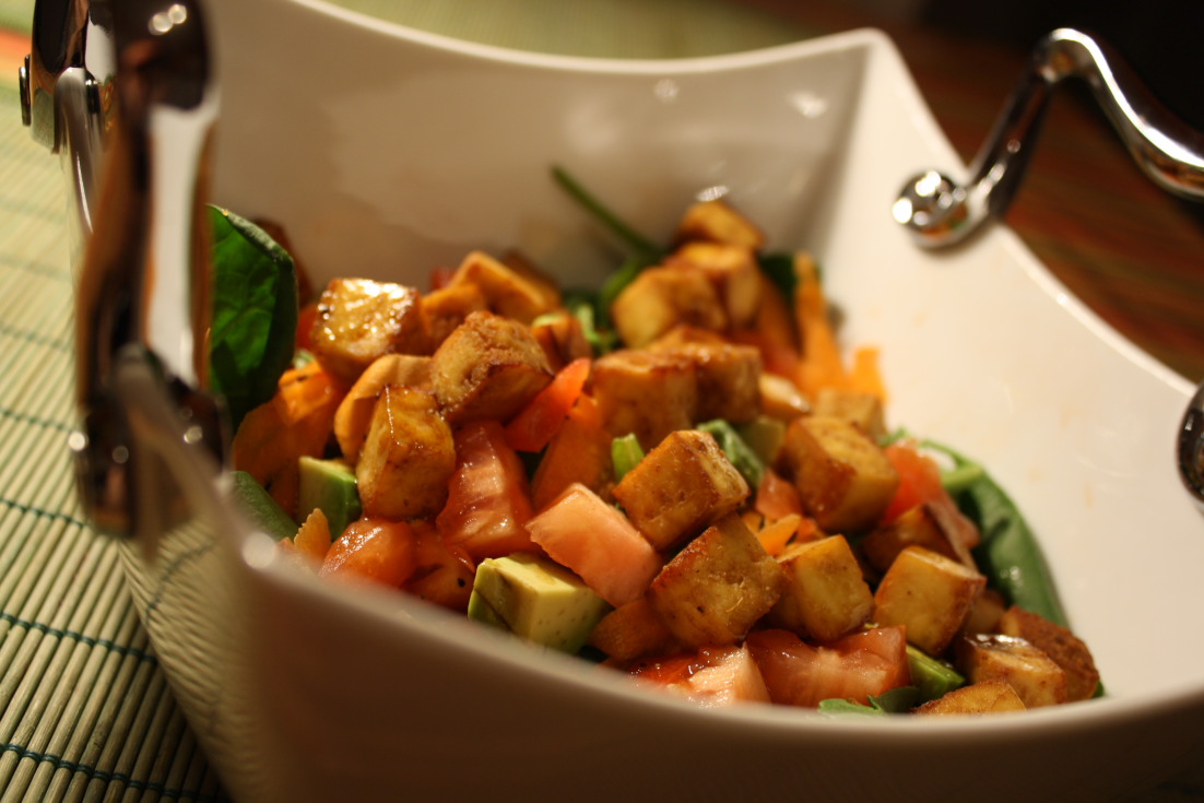 Je suis finalement sortie indemne du boulot. Ce soir, j’ai fait ça simple : une salade d’épinards et croutons de tofu!
