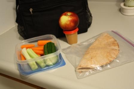 Comme dîner, un pita de blé entier, 2 c. à soupe de beurre de peanuts naturel, une pomme et des crudités.