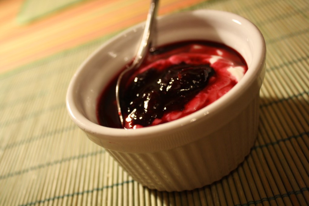 Et comme dessert, environ 100 g de yogourt nature et 1/2 c. à soupe de confiture de bleuets maison.