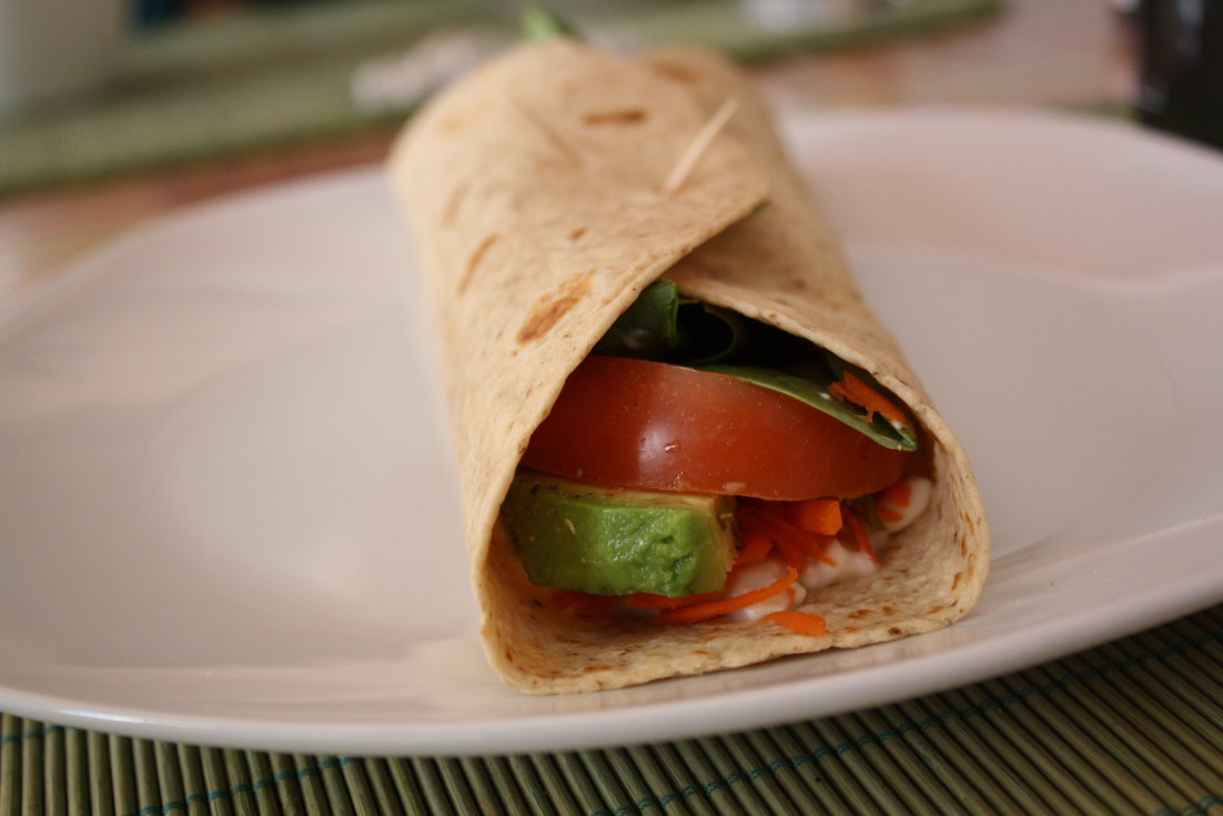 Wrap aux légumes (épinards et carotte) et aux fruits (avocat + tomate) :