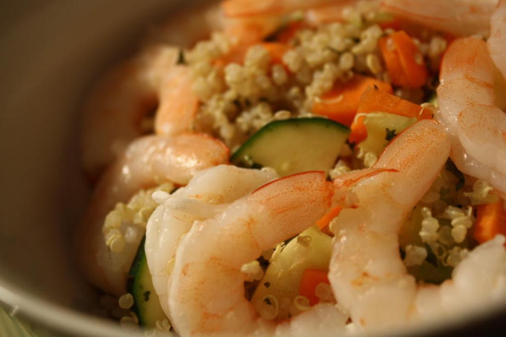 Comme souper, j’avais un restant de quinoa (qui n’a heureusement pas passé dans les céréales de ce matin) que j’ai transformé en salade de quinoa aux crevettes. Merveilleux! Ma soeur et mon père ont tous les deux goûté lors de mon passage à Québec à Noël et les deux ont bien aimé. N’ayez pas peur d’essayer le quinoa, c’est un super bon grain!