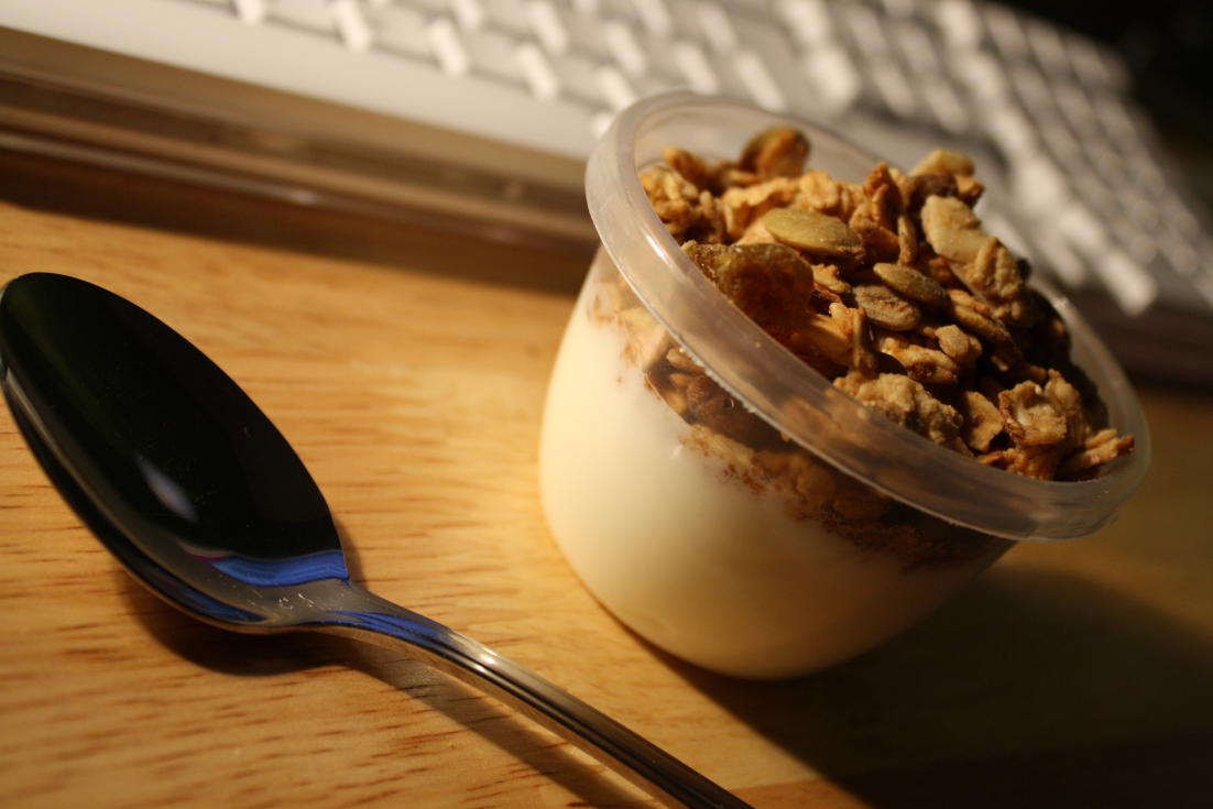 Comme dessert, plus pour me garder éveillée encore quelques heures que parce que j’avais faim : un yogourt avec 1 c. à soupe de graines de lin moulues et un peu de granola.