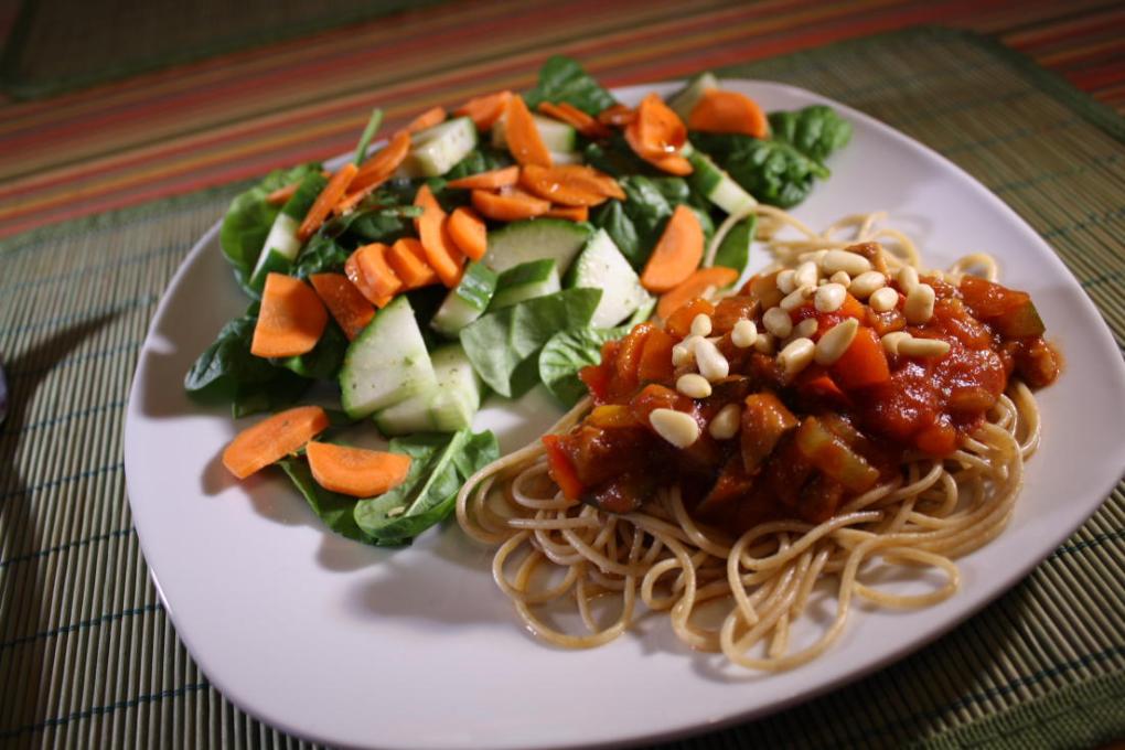 Pour souper, un spaghetti accompagné d’une salade verte. Vous trouverez ma recette de sauce à spag dans la section recettes. J’ai ajouté environ 1 c. à soupe de noix de pin pour les protéines.