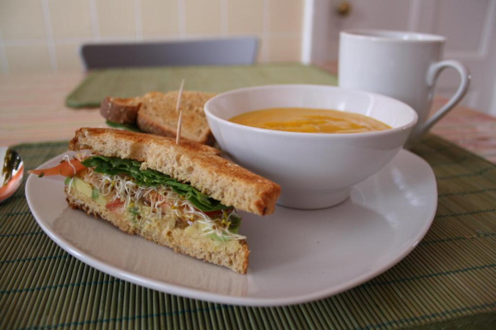 Comme lunch, j’ai refait le sandwich d’hier (je devais finir l’avocat, il commençait à tirer sur le brun pas mal…) accompagné de potage à la courge (recette dans le livre l’Express végétarien). C’était toujours aussi bon!
