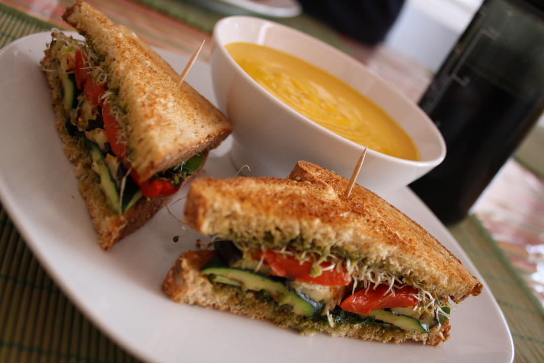 Je suis en retard sur mon horaire aujourd’hui… Je devrais être au gym alors je fais ça court! Mon lunch ce midi était à nouveau excellent : les dernières goûtes du potage à la courge et un sandwich aux légumes grillés.