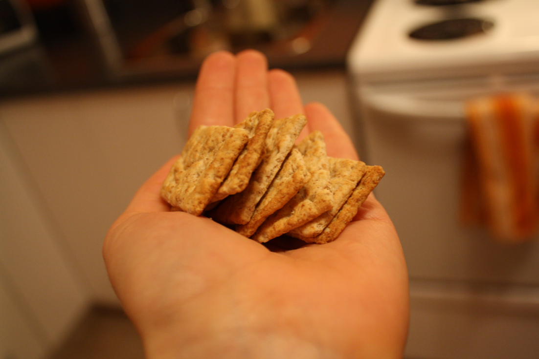 Avant de me rappeler qu’on a justement vu au cours hier soir que, pour optimiser la récupération après un entraînement, il faut combiner des glucides et des protéines. Le céleri n’est pas une source incroyable de glucides (1,5 g pour une branche de 20 cm – pour vous donner une idée, une portion de glucide = 25 g) alors j’ai plongé la main dans le sac de craquelins Kashi (cette poignée x2). J’ai touché le fond, snif!
