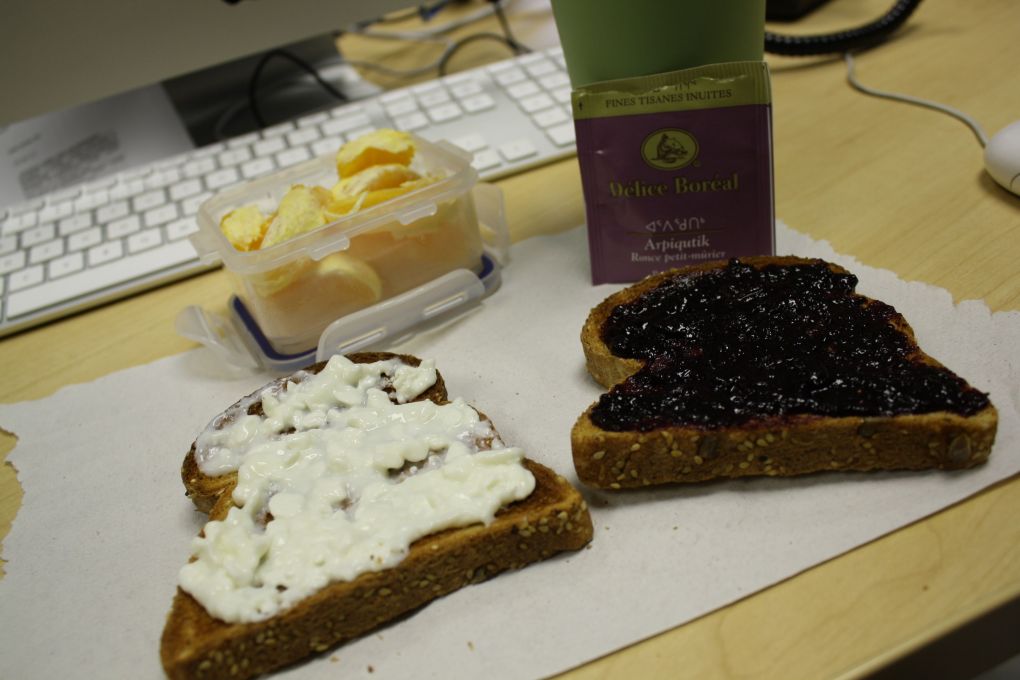 Trève de plaisanteries, me voilà de retour au boulot ce matin. Petit déjeuner bien simple… Deux tranches de pain grillé tartiné de fromage cottage et de confiture de bleuets, avec une orange et un thé Ronce petit-mûrier de Délice Boréal. Si vous n’êtes pas un adepte de thés mais que vous souhaitez commencer à en boire, je vous recommande ce thé! Il sent et goûte les brioches, mium!
