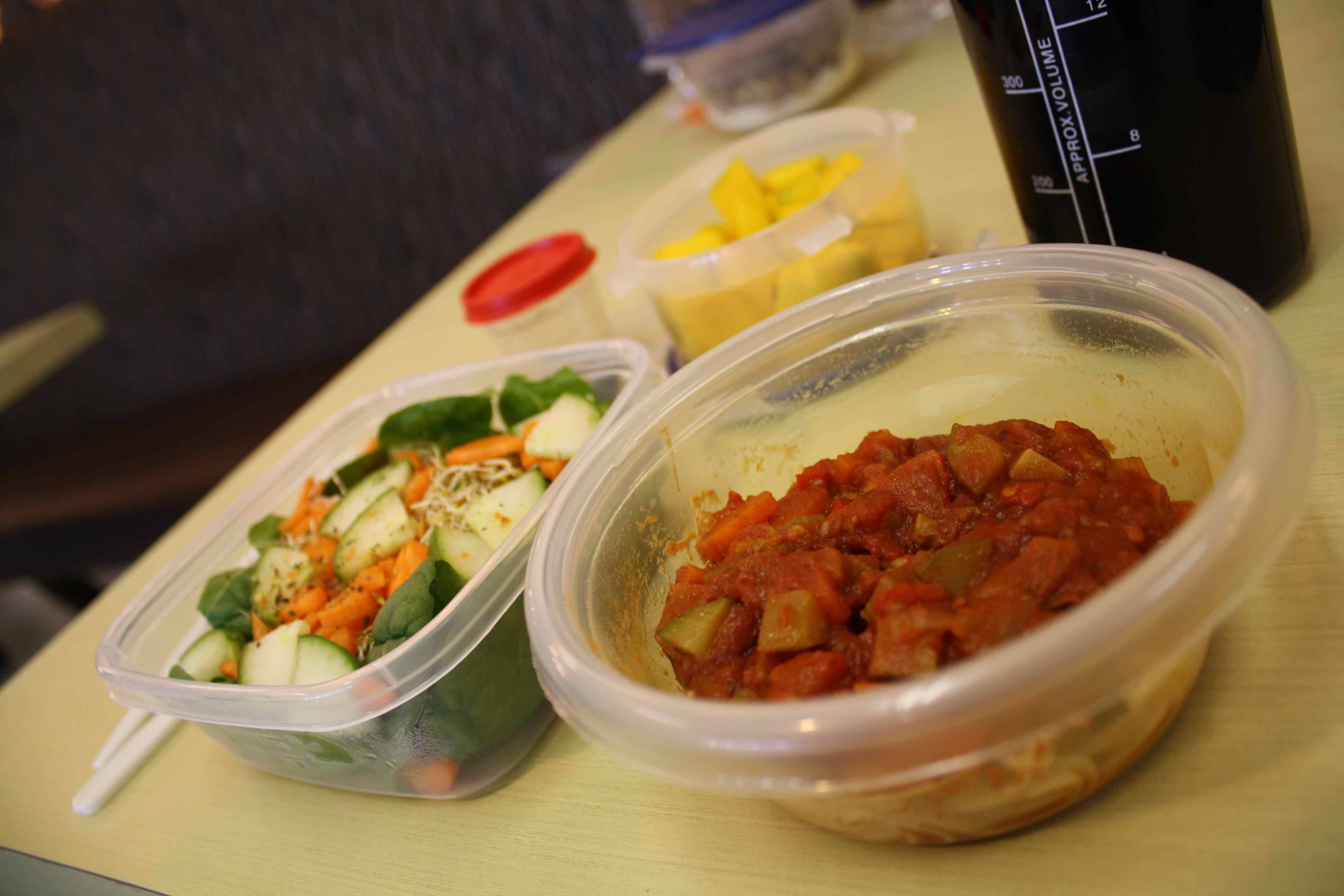 Dans mon lunch ce midi : du spaghetti avec une salade verte arrosée de vinaigrette maison (HO, VB et SÉ) et, comme dessert, la moitié d’une mangue pas tout à fait mûre…