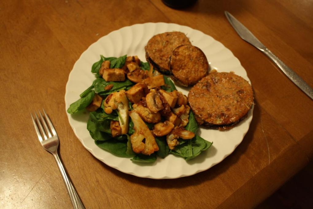 Un sauté de légumes et tofu sur un lit d’épinards accompagné d’aubergines panées au parmesan. Je ne vous parle pas de la quantité d’huile par contre… Ouf!