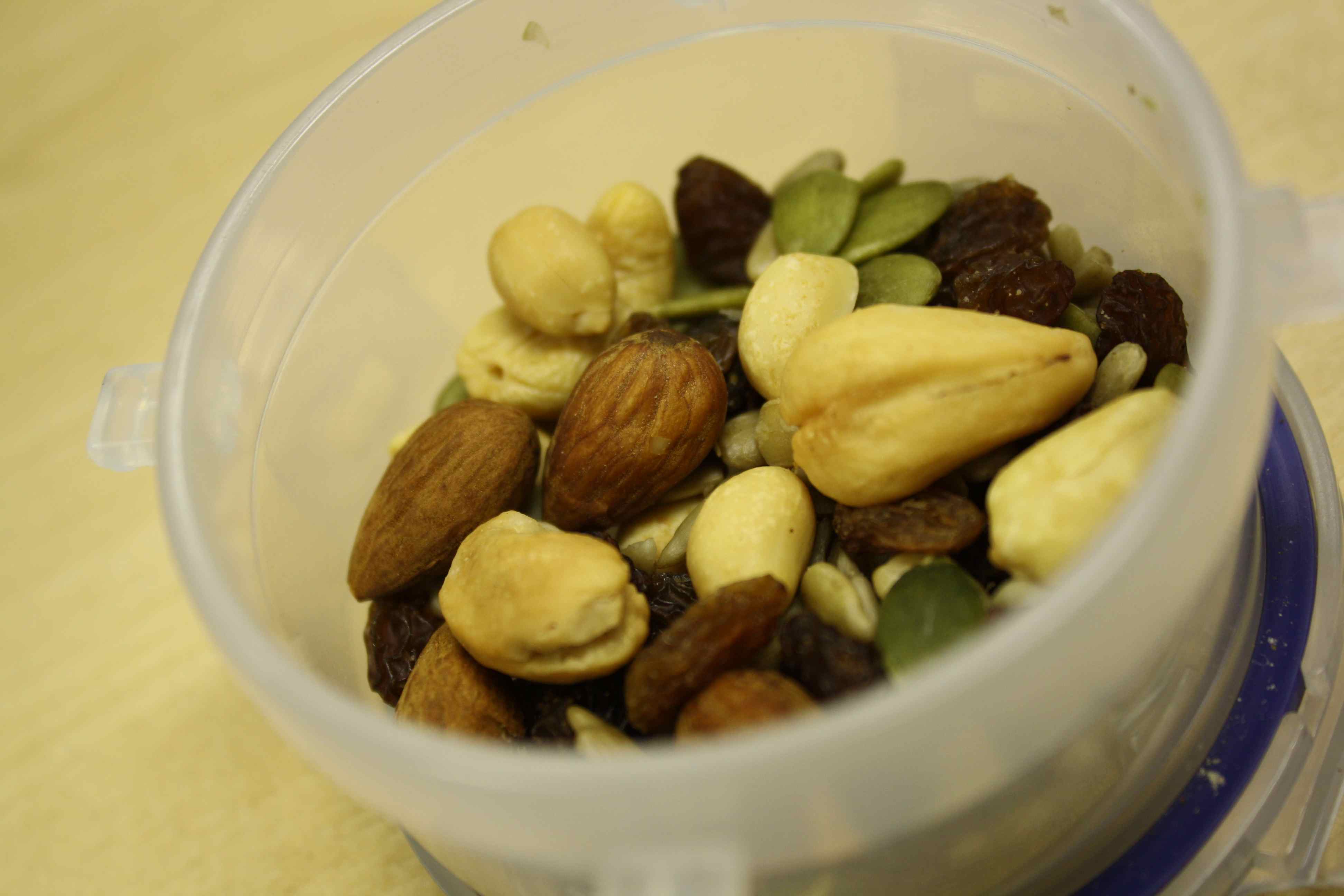 Malgré le gros déjeuner de ce matin, j’ai sorti mes noix mélangées pour grignoter avec ma pomme.