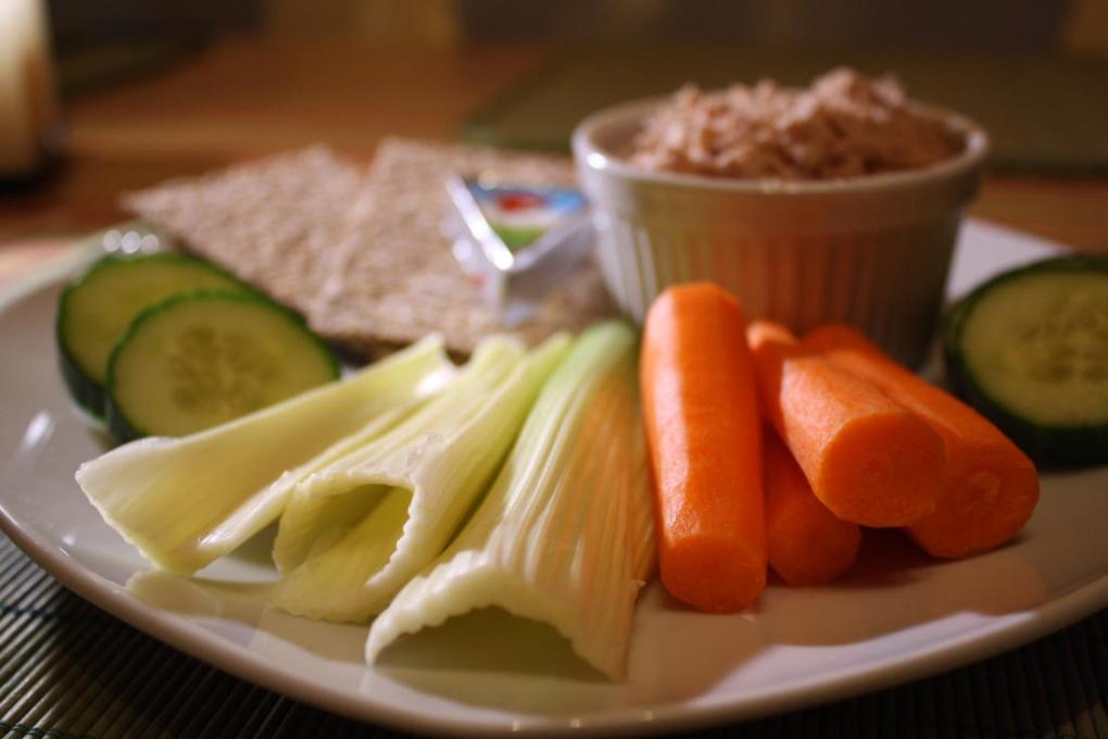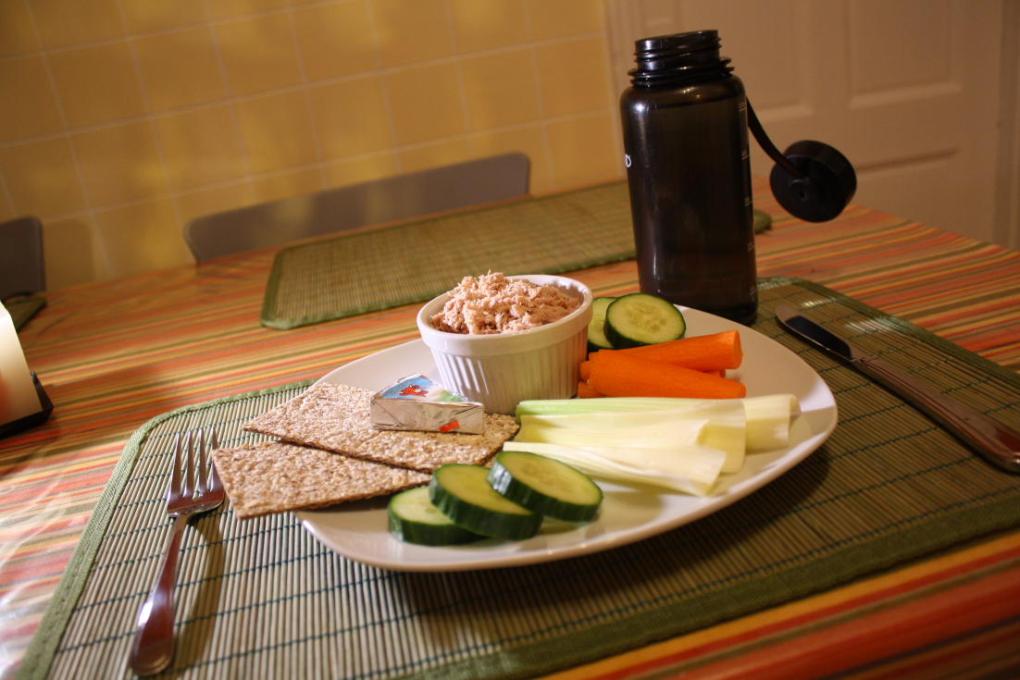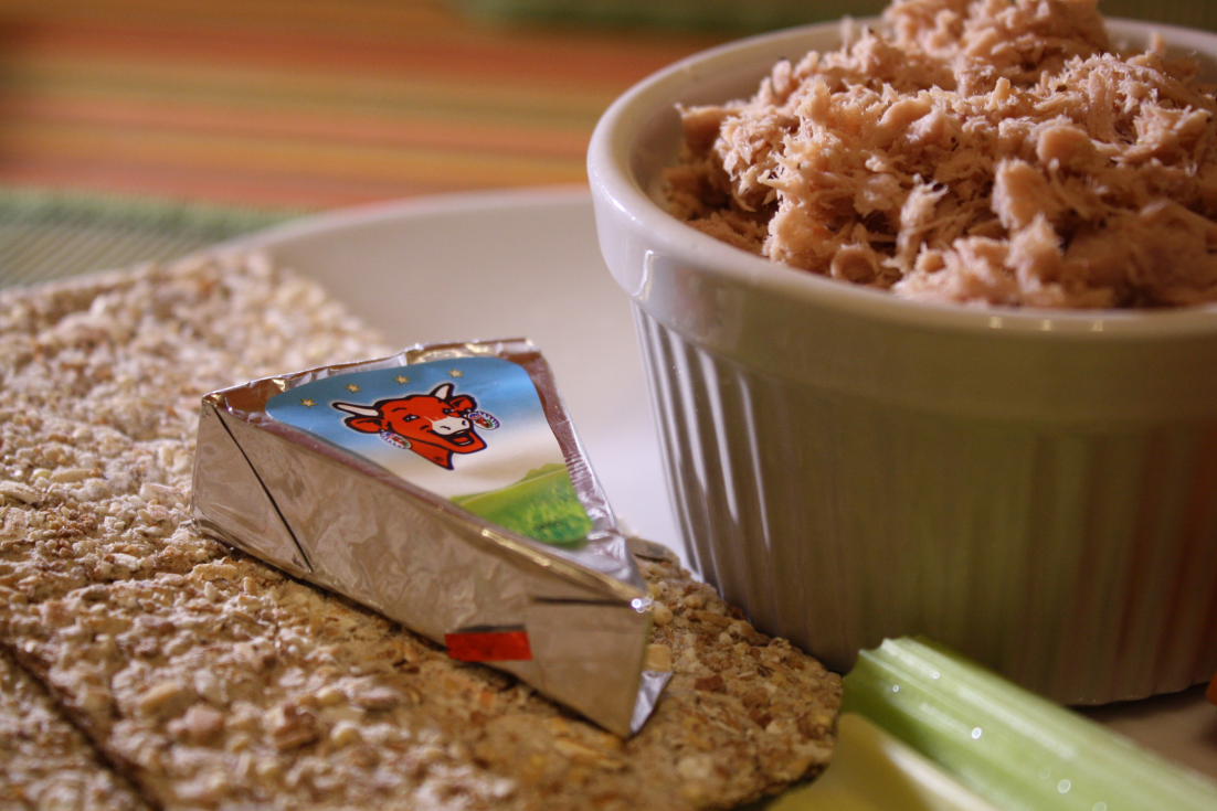Donc, pour souper : des crudités, deux biscottes 5 grains de Kavli, le reste de mon thon de ce midi et 1 petit fromage La Vache qui rit léger.
