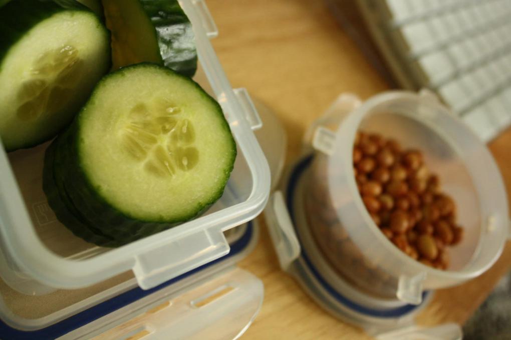 Comme collation d’après-midi : quelques rondelles de concombre et 1/4 de tasse de graines de soya rôties.