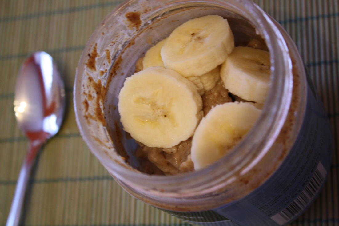 Voici ma petite nouveauté du matin : du gruau servi sur un fond de beurre d’amande. Je vois ça sur des blogues depuis plusieurs mois déjà mais je n’avais jamais pu l’essayer puisque mon pot de beurre d’amande est habituellement gigantesque… Il faudrait que je le mange avec une longue cuillère de bois. Hey, ce n’est pas une mauvaise idée ça. 🙂