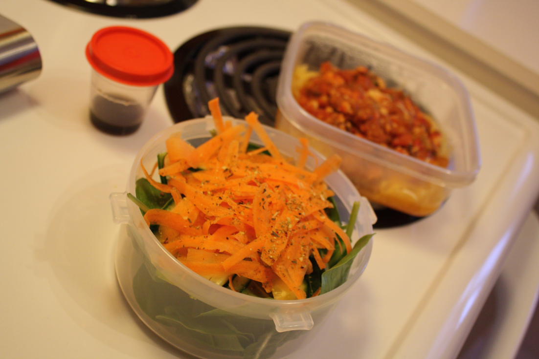J’ai amené mon lunch à l’université, ça ne me disait pas de souper à 16h30… J’ai donc réchauffé le reste de la courge spaghetti de mardi soir et amené une salade verte en accompagnement (épinards, concombre, carotte). Sans oublier la vinaigrette maison (HO, SÉ et VB).