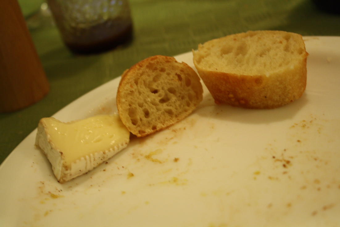 Deuxième service : 2 tranches de baguette Première Moisson (mium) avec un morceau de Camembert.