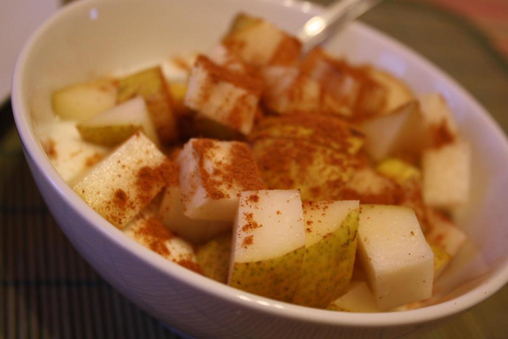 Hier après-midi, j’ai fait un pain aux dattes et au noix (quelqu’un voudrait la recette?) donc, ce matin, j’ai dégusté ma création avec 150 g de yogourt nature, 1 poire en morceaux, 1 c. à soupe de graines de lin moulues et de la cannelle. J’ai oublié de mettre de la cannelle dans le pain alors il manque un peu de goût. J’ai ajouté de la confiture de bleuets pour compenser. 😉
