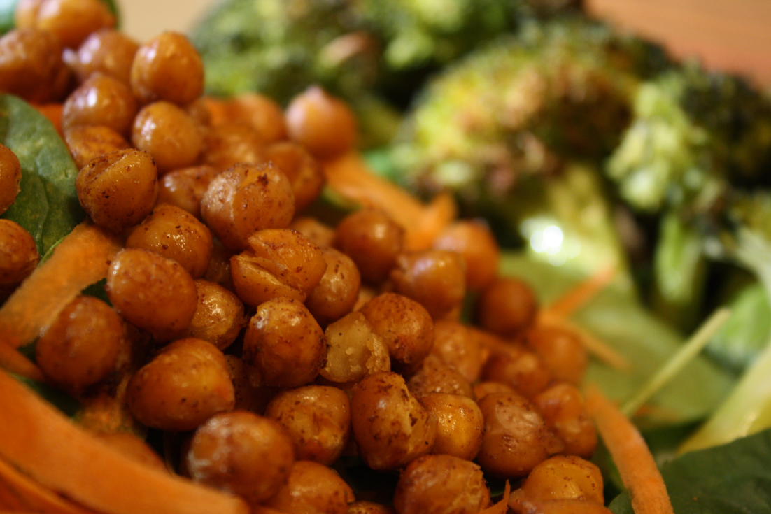 J’ai fait cuire les brocolis avec un peu d’huile d’olive et de sel d’ail pendant 30 minutes à 400. Même chose pour les pois chiches sauf que je les ai également saupoudré d’épices douces mélangées. J’aurais dû couper mes brocolis plus petits, les gros morceaux sont restés durs.