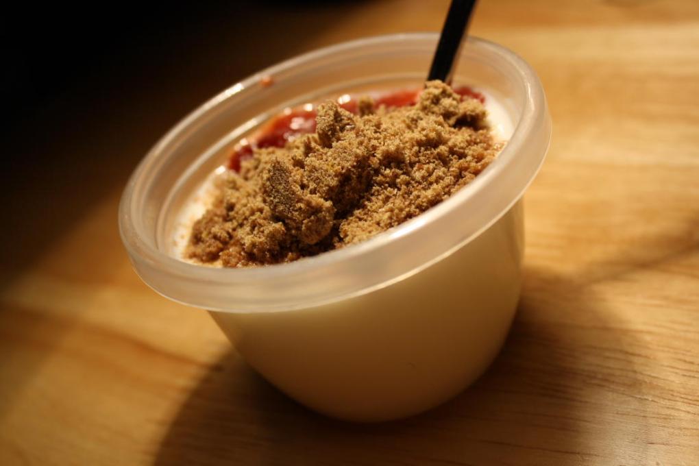 Pour satisfaire ma dent sucrée : 100 g de yogourt nature, 1 c. à soupe de graines de lin moulues et 1 c. à thé de confiture de fraises et rhubarbe maison.