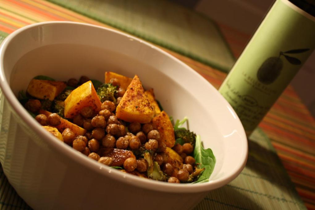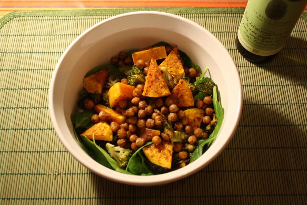 Mon souper était du tonnerre! Un mélange de courge Butternut, de brocoli et de pois chiches sur un lit d’épinards, le tout arrosé d’un filet d’huile d’olive. Vous ne trouvez pas que je sonne comme un menu de resto chic?
