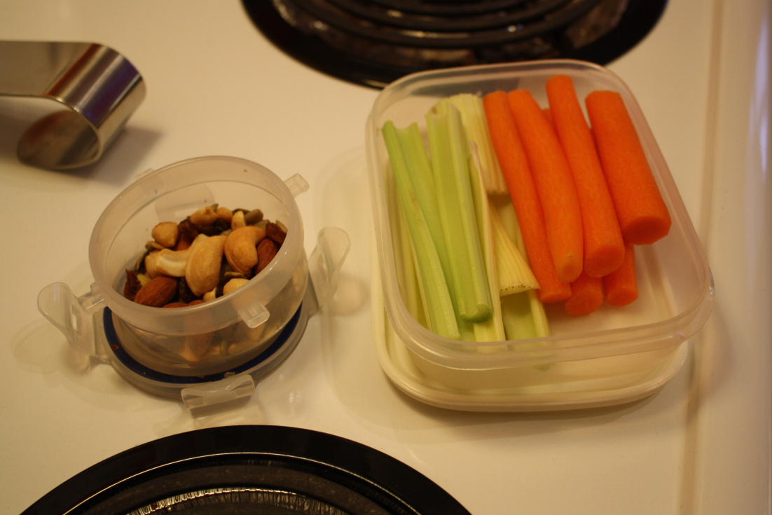 J’avais amené des crudités et des noix au cas où j’aurais une fringale pendant l’examen mais, comme j’ai fini ça en 1h30, je l’ai ramenée à la maison. J’ai mangé les crudités mais remplacé les noix par la seconde moitié de petit pain aux bananes. Trop moelleux c’est dangereux…
