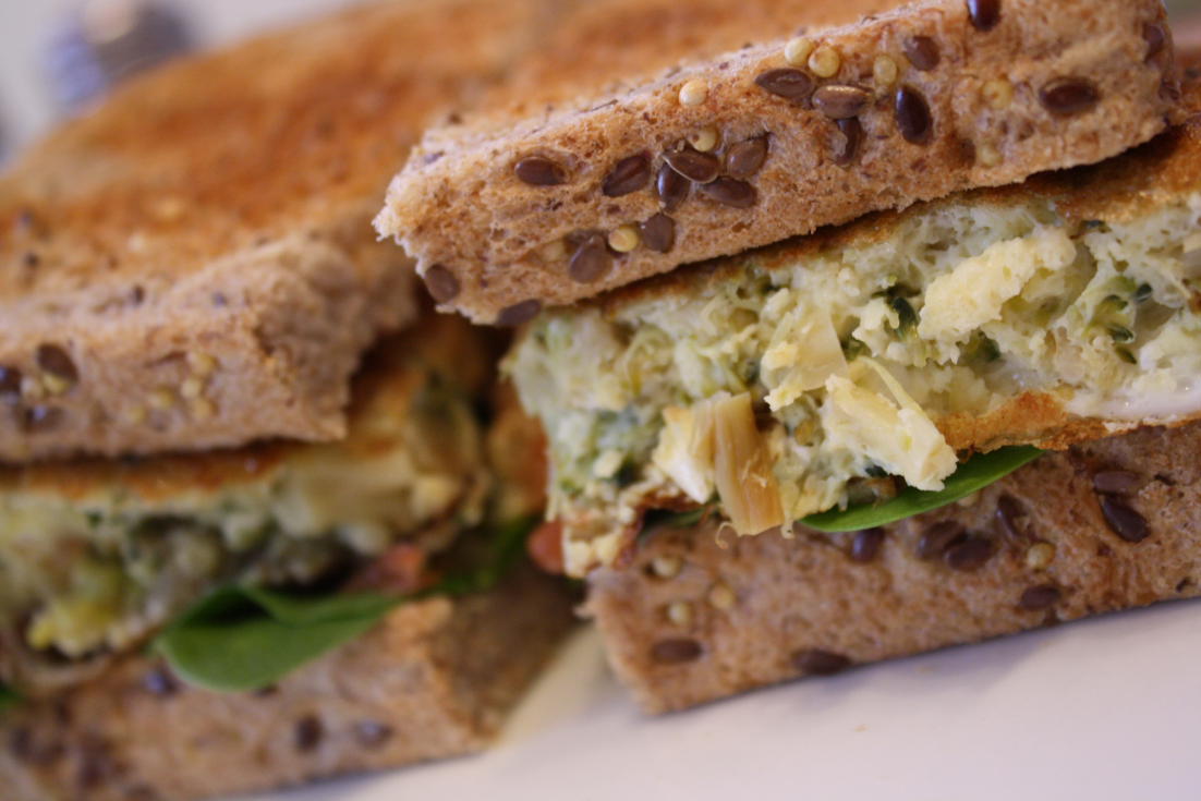 Coupez l’omelette en deux et déposez les deux parties sur une tranche de pain de blé entier recouverte d’épinards et de tranches de tomate. Déposez la seconde tranche de pain et dégustez!
