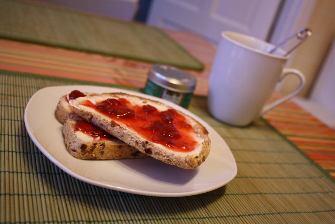 Pour mon dernier samedi matin à me lever tôt, j’ai préparé des rôties avec deux morceaux de fromage La vache qui rit léger et de la confiture de fraises et rhubarbe maison.