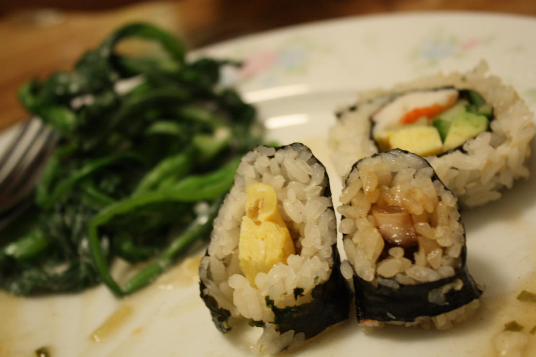 Par la suite, nous avons eu droit à des sushis faits maison. Pour en avoir fait une fois, je peux vous dire que ça prend de la patience en titi! Ceux-ci étaient pas mal plus complets que les miens! J’ai pris deux petits morceaux aux shitakes et trois au tamago (omelette japonaise) plus 2-3 morceaux de rouleau Californien (avocat, concombre, goberge et tamago).