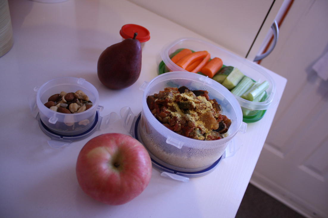 Un restant de ratatouille aux lentilles sur du couscous de blé entier et une poire rouge (finalement, une fois mûres, ces poires sont succulentes) pour dîner. J’ai saupoudré de la levure nutritionnelle sur la ratatouille. Ces petits flocons au goût de fromage (je ne suis pas convaincue que ça goûte le fromage mais ce n’est pas méchant en tout cas) sont très riches en B12, une vitamine difficile à consommer en quantité suffisante lorsque l’on suit un régime végétarien. On peut en saupoudrer sur des salades, des pâtes, des pizzas, etc. Certains en mettent même dans les pâtisseries ou le yogourt. Ça fait un bout de temps que j’en ai acheté un sac mais je l’avais oublié au fond de mes armoires…