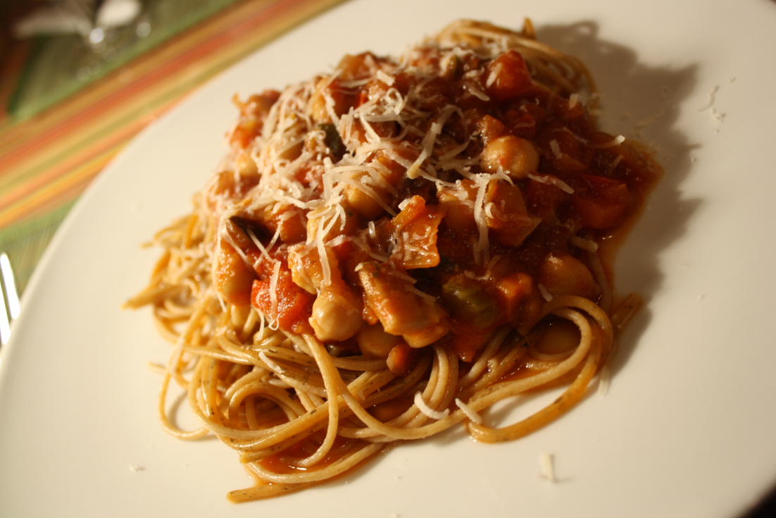Dans la lignée de « je ne me casse pas la tête aujourd’hui », j’ai réchauffé de la sauce à spaghetti aux légumes à laquelle j’ai ajouté des pois chiches. Sur des pâtes au blé entier et saupoudrée de parmesan, c’était à se lécher les doigts!