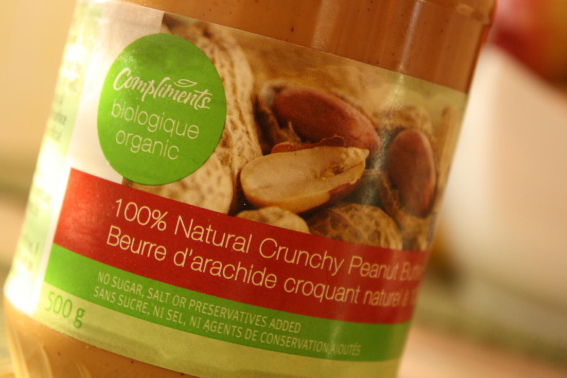 Ce matin, j’ai ouvert un nouveau pot de beurre d’arachide croquant Nos Compliments Bio. J’ai eu toute la misère du monde à intégrer l’huile jusqu’au fond. En fait, la plus grande partie s’est retrouvée sur mes mains, à l’extérieur du pot… C’est probablement dû aux gros morceaux de peanuts. Bref, pour les initiés seulement. Au goût, il est aussi bon que le beurre d’arachide naturel Nos Compliments non-biologique, ma marque habituelle.