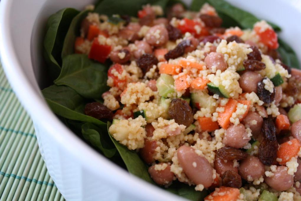 À mon retour du travail, j’ai refait mon mélange d’hier : salade de légumineuses et coucous avec des raisins, sur un lit d’épinards. Il m’en reste encore pour demain midi, et le surlendemain et le surlendemain, ahah!