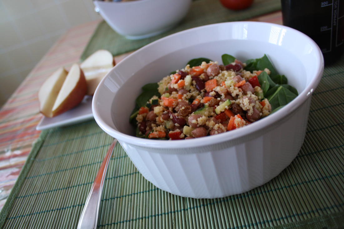 Bon, excusez mon manque d’originalité mais je dois finir ma salade de légumineuses et couscous alors mon lunch d’aujourd’hui est pratiquement une copie conforme de celui d’hier. Remplacez la nectarine par une poire Anjou rouge et vous y êtes.