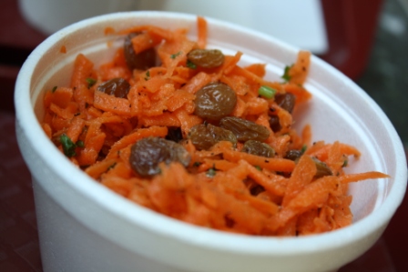 Après mon expérience très concluante de raisins secs dans le couscous, je me suis dit que j’essaierais la salade de carottes râpées et de raisins secs… Déprimant. Ça pourrait être excellent avec un peu d’épices par contre. Je vais sûrement essayer d’en faire une meilleure à la maison.