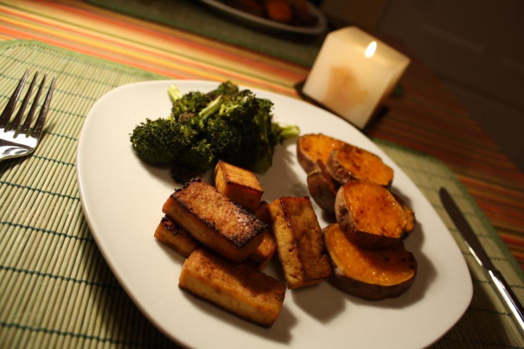 Servi avec du brocoli cuit au four (avec les patates mais les 30 dernières minutes seulement) et des croquettes de tofu (toujours avec les patates mais les 20 dernières minutes seulement). Le brocoli était simplement assaisonné de sel d’ail et les croquettes de tofu ont été mariné dans la sauce spéciale tofu.